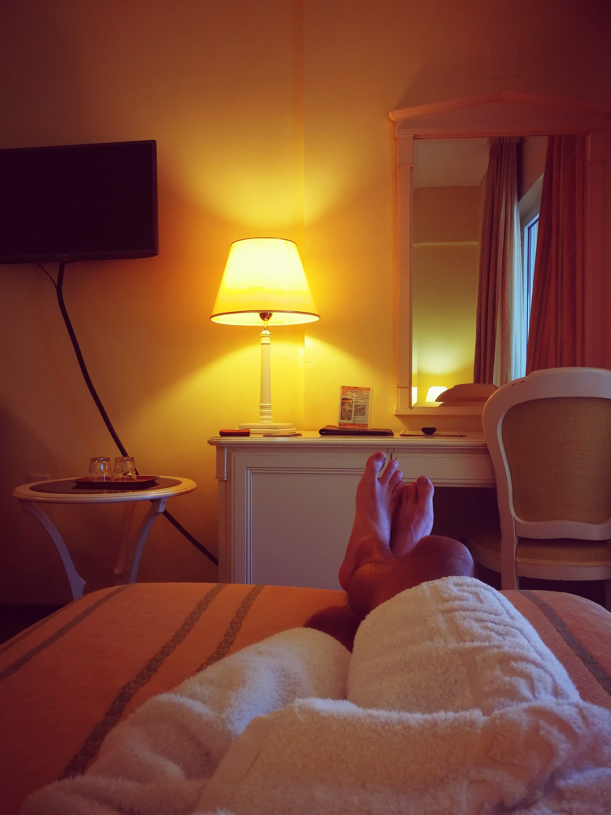 En arrivant dans la chambre, je me jette immédiatement sous la douche. Les voyageurs connaissent cette sensation tellement agréable du contact de l’eau chaude qui coule sur cette peau sale qui n’a pas vu de pommeaux depuis des jours. Un vrai bonheur ! J’enfile ensuite le peignoir puis je me jette sur le lit. Il fait vingt degrés dans la chambre, soit presque 20 de moins qu'au-dehors. La sieste est inévitable.
