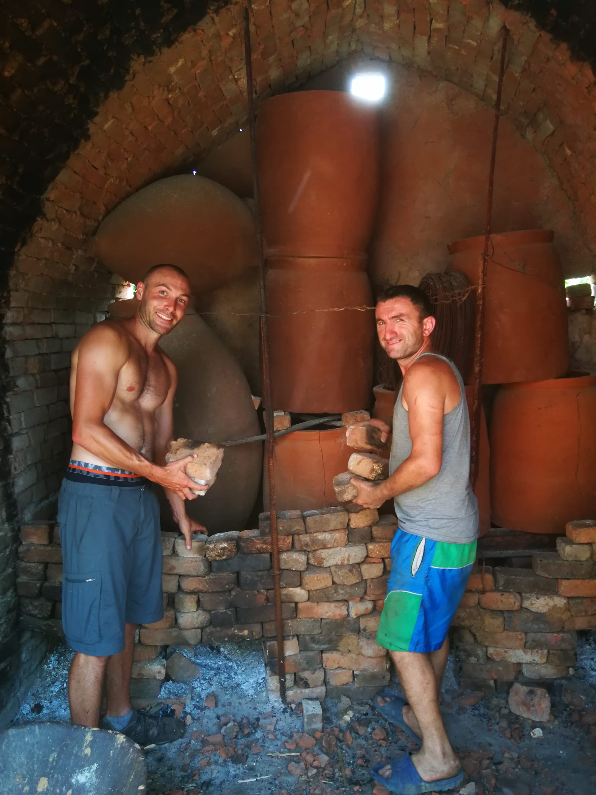 Nous passons une journée à les aider à faire cuire plusieurs amphores séchées. Nous les transportons pour cuisson dans un grand four en briques bâti près de la maison. Il faut descendre les énormes barriques du grenier (forcément, si elles avaient été stockées en rez-de-chaussée, on se serait ennuyé) avec une espèce d’ascenseur fait maison qui ne donne pas confiance et sur lequel Fofi ne veut pas mettre un pied. Bon, il n’y a que ça, on a le goût du risque ou on ne l’a pas !