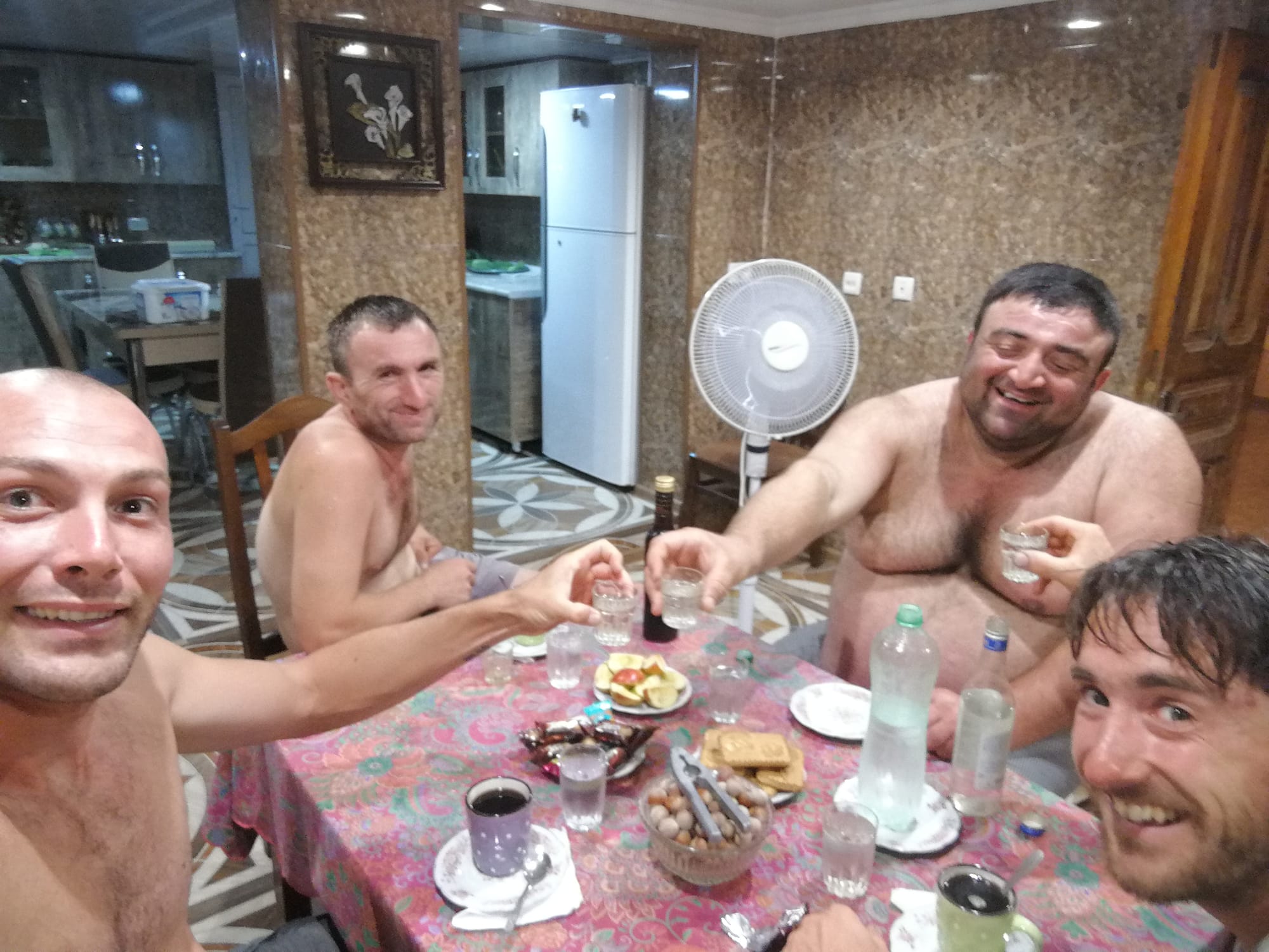 Nous célébrons la fin du labeur avec un bon repas accompagné de tchatcha, une gnôle locale à... à l'alcool ! Un truc à décoller le papier peint.