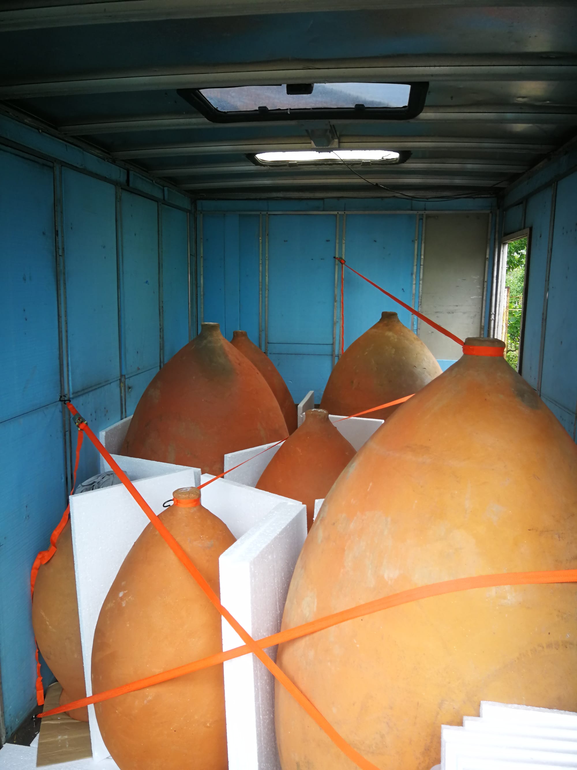 Une dizaine d'amphores de 200 et 60 litres est maintenant stockée dans mon camion, enveloppées de panneaux de polystyrène, puis sanglées tant bien que mal. Il faut espérer que les 5000 km qui les attendent ne signent pas la fin de leur existence.
