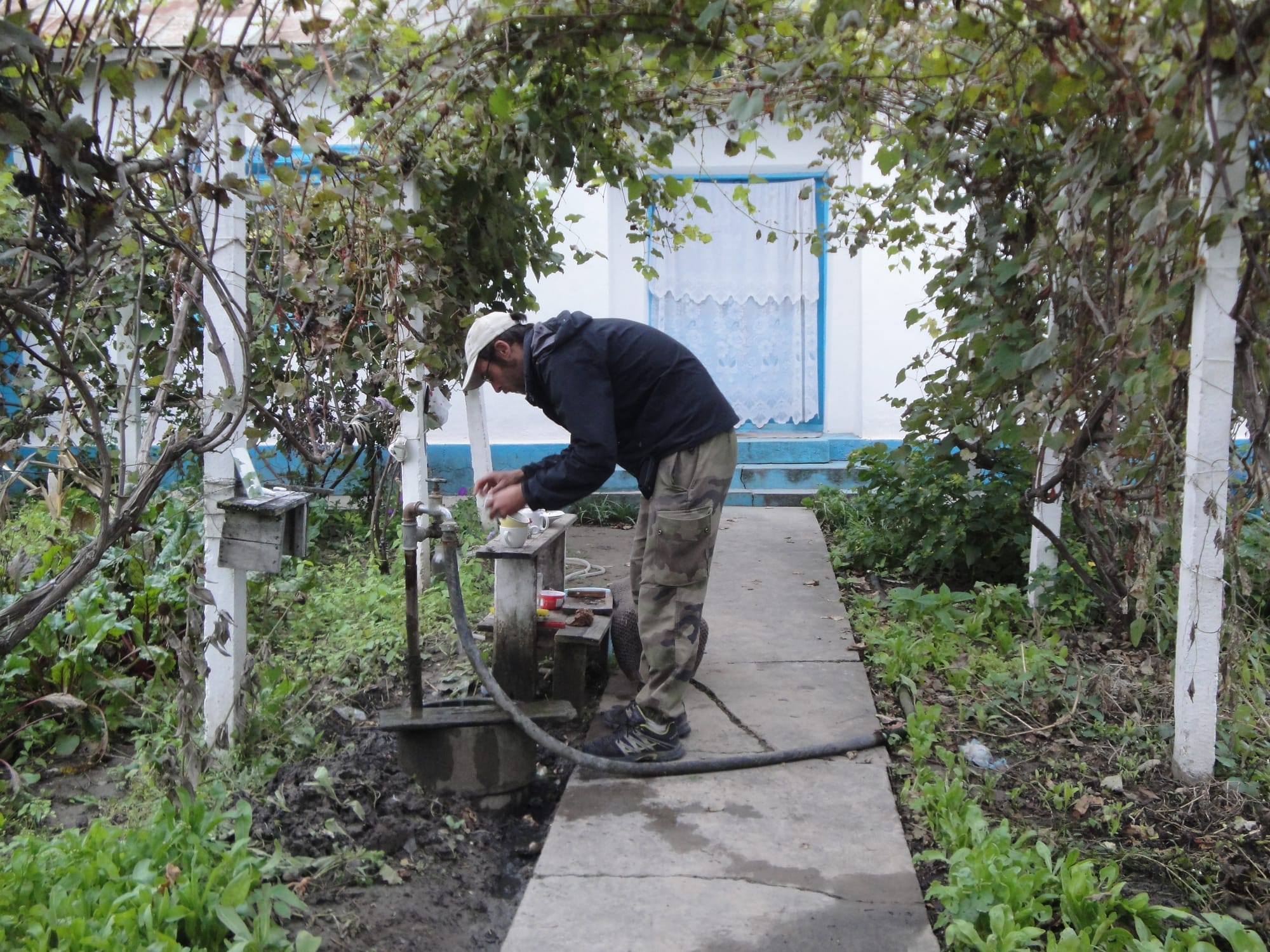 Il y a une sorte de pompe à eau… qui doit dater de Ceaușescu. Pas loin, il y a les chiottes… une simple petite guitoune en bois… sans eau courante, évidemment.